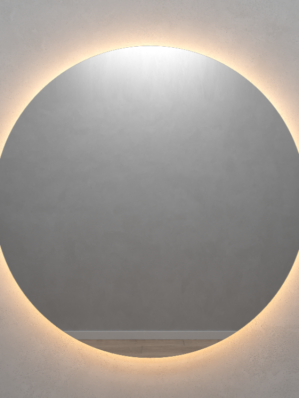 Безрамное зеркало круглой формы с контурной (тыльной) тёплой подсветкой, свет 3000К. Подложка из высококачественного МДФ, светодиодная лента защищена матовым свето-рассеивателем от попадания пыли и влаги. Есть вывод 220W для подключения к сети, включение подсветки от выключателя на стене, либо от розетки.
